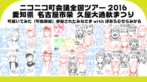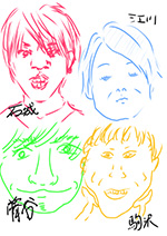 「町似顔絵」にて、せらみかる&ぽあろが来場者を描いた似顔絵が完成! ROOT FIVEメンバーがそれぞれを描いた似顔絵も! (描いた色…黄:ぽこた 赤:けったろ 青:koma'n 緑:みーちゃん) ①、②を描いた様子は「kakooyo!」サイトで閲覧できます。 kakooyo! ※じっくり過程を見るには、お絵描きチャットアプリ「kakooyo!」のAndroid/iPhoneアプリをダウンロードしてください。